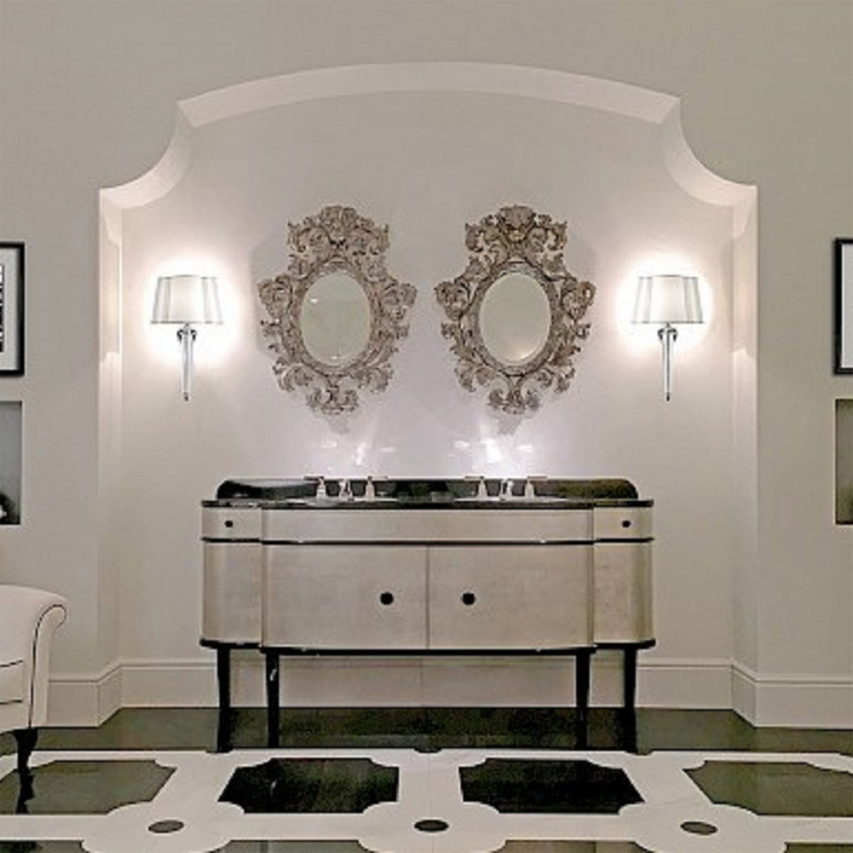 Devon & Devon collections have their own unmistakable contemporary classic style, which results in an elegant interaction of Art Deco, Victorian and Florentine Renaissance style, also reminiscent of the Jazz Age and Hollywood style atmospheres, such as the Music, Jetset and Miami vanities and the Claridge double console.