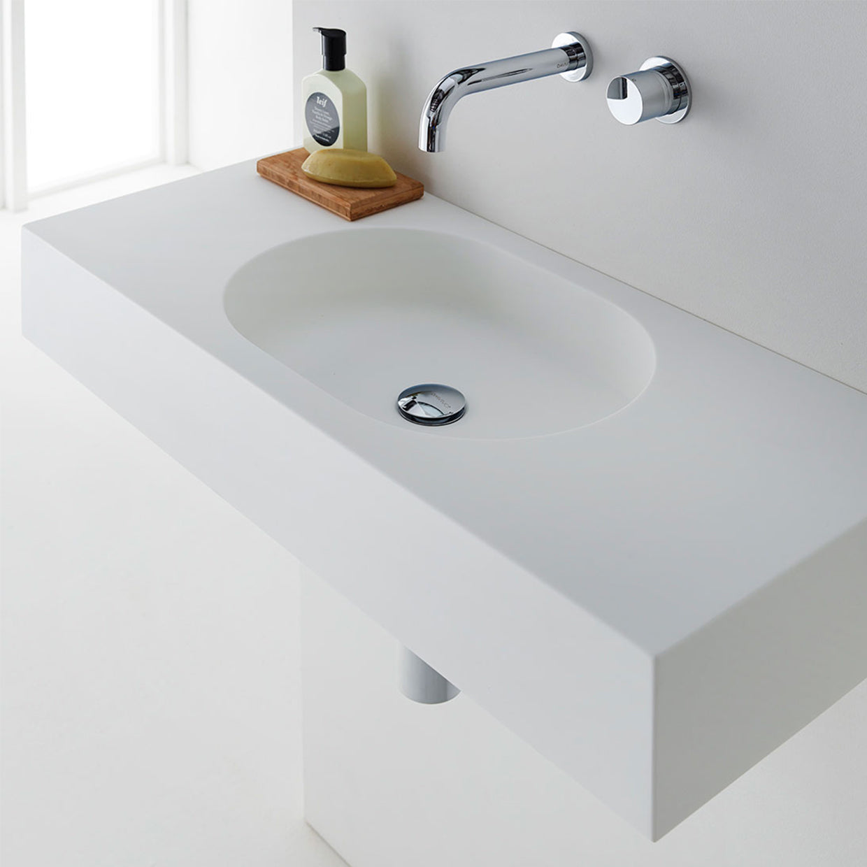 The Arki 900 wall basin featuring a contemporary capsule-shaped bowl symbolises modern structural design with its clean architectural lines making Arki ideal for every contemporary bathroom.